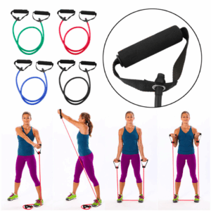 Bandas de resistencia elásticas con asas para ejercicio en casa. Perfecta para rutinas de entrenamiento dirigidas al aumento del cardio, pérdida de peso y aumento de músculo. Portatil y de material resistente al agua y al sudor, diferentes niveles de fuerza.