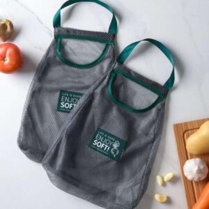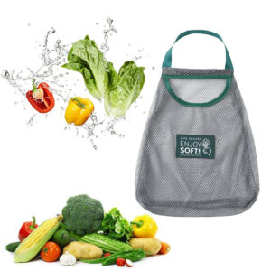 Resistente bolsa de malla transpirable para almacenamiento y conservación de alimentos perecederos. Puede utilizarse dentro del refrigerador como clasificador de alimentos, o como escurridor para alimentos recién lavados. Cuenta con un asa para colgar. Ideal para ajos, gengibre, chiles, hortalizas, frutas y verduras. 100% lavable y reutilizable.