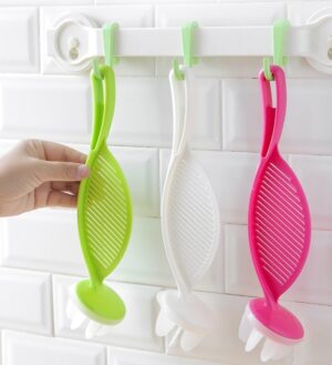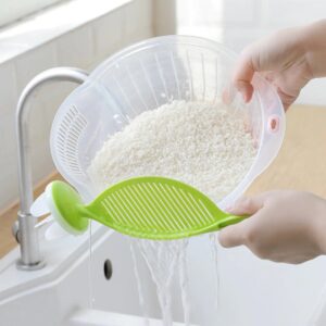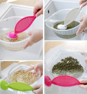 Colador y limpiador multifuncional de cocina. Su forma permite lavar semillas, granos, fruta y verdura sin tocar con las manos, y utilizar su mango como escurridor. Hecho de material plástico de alta calidad con certificado alimentario, no tóxico, resistente y no guarda olores.