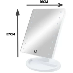 Espejo con 16 focos de luz LED fría y rotación 360 grados. Ideal para utilizar en tu rutina de belleza o skincare, su luz potente brinda gran detalle en el rostro. Modo de encendido mediante cable USB y baterías (no incluídas). Incluye base con compartimento para joyas/accesorios.