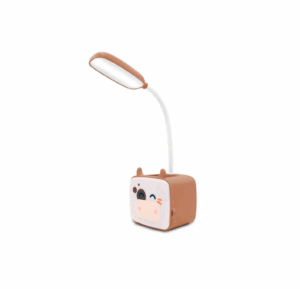 Divertida lámpara con forma de vaquita, con porta lápices y dos modos de luz. Ideal para recámara, escuela o estudio. Incluye cable de carga.