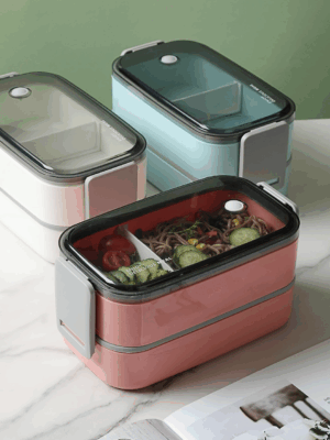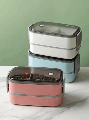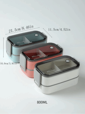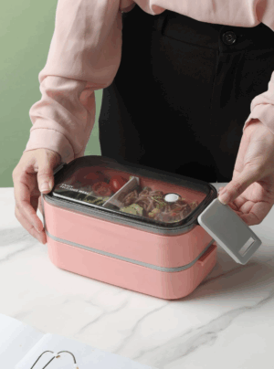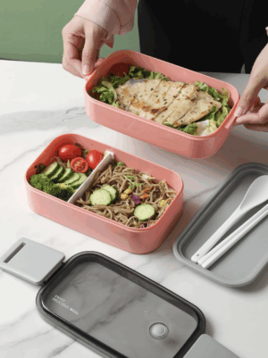 Lunch Box térmica con dos compartimentos y división ajustable. Incluye par de cubiertos (cuchara y tenedor) eco-friendly y tapa de doble cerrado con protector de goma que evita derrames. Disponible en tres colores.