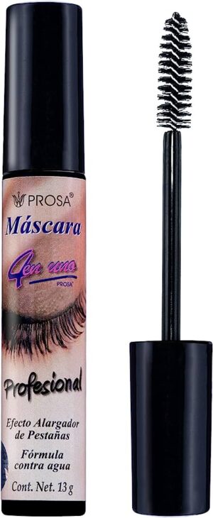 Máscara para pestañas marca PROSA, con Fórmula Intense resistente al agua (Waterproof) que aporta un color intenso y volumen. Incluye un Cepillo Profesional que eleva y define cada una de tus pestañas para una aplicación perfecta.