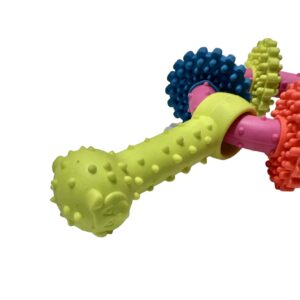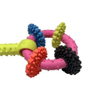 Juguete mordedera para perro hecha de silicona de alta calidad, cuenta con cuatro ruedas que estimulan el tacto de tu mascota y una tira para interactuar. Disponible en tres llamativos colores.