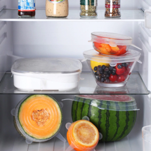 Set de 6 piezas de silicona con función de tapa/cubierta para tuppers o frutas. Su material de alta calidad evita derrames y conserva los alimentos frescos prolongando su buen estado. Pueden ser utilizados en hornos de microondas para calentar alimentos gracias a su resistencia a altas temperaturas. El set contiene 6 cubiertas de tamaños distintos para adaptarse a frutas pequeñas y vasos hasta recipientes más grandes. 100% lavable, con calidad alimentaria comprobada.