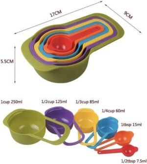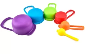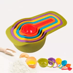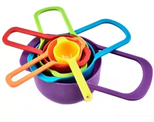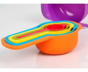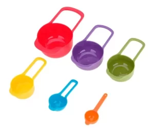 Set de seis cucharas medidoras ideales para repostería y cocina. Hechas de plástico ligero de calidad alimentaria, ideales para servir medidas exactas de líquidos, especias, polvos y más.