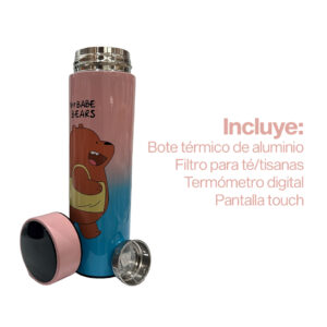 Termo para bebidas frías o calientes con tres modelos diferentes edición «We Bare Bears». Cuenta con filtro para tés o tisanas, y termómetro digital y pantalla touch en la tapa. La mejor manera de llevar tus bebidas con tus personajes favoritos.